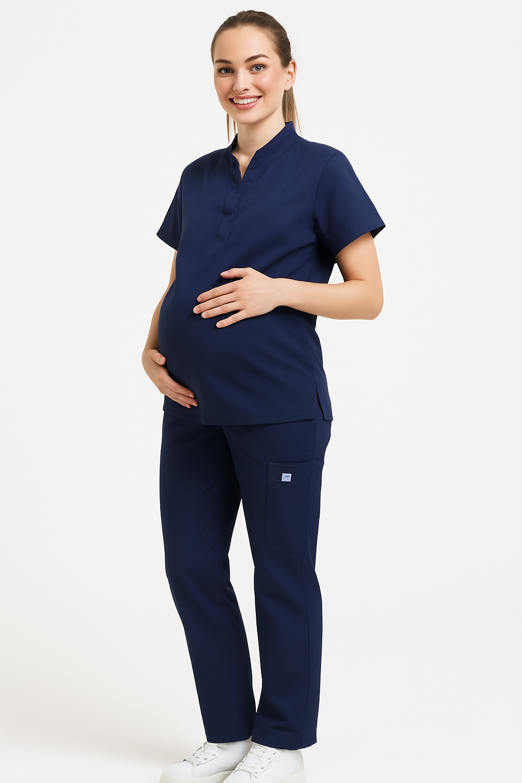 Crafted from a premium polyester-cotton blend with stretch, the fabric is breathable, wrinkle-resistant, and soft on sensitive skin—making it ideal for long hospital hours. The top provides a relaxed, flattering fit without compromising on a polished appearance, while the pants feature practical side cargo pockets and a flexible waistband that gently accommodates a growing belly.